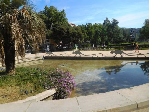 El Castell dels tres dragons, esta dins del Parc de la Ciutadella, en la cantonada entre el pg. De Picasso, 5 i pg. de Pujades, 8-10 de Barcelona, la Bassa esta front d’aquest.Popularment anomenat Castell dels Tres Dragons, fou construït el 1887-88 com a Cafè-Restaurant de l’Exposició Universal de 1888 per Lluís Domènech i Montaner qui, posteriorment, hi instal·là un taller d’arts industrials vinculades a l’arquitectura, amb la possible col·laboració d’Antoni M. Gallissà i Suqué.En acabar l’exposició l’edifici restà abandonat i el 1891 l’alcalde, Joan Coll i Pujol, demanà a Domènech que “acabés l’obra” tot adaptant-la per acollir un “Museu de la Història”.L’any 1920 allotjà el Museu de Zoologia de Barcelona. L’any 2010 es van traslladar moltes de les seves col·leccions públiques cap al Museu Blau . El 2015 es va fer pública la intenció de promoure la rehabilitació d’aquest emblemàtic edifici patrimonial.La Bassa no es gaire gran, disposa d’un sortidor i aigua en moviment. Una jove palmera es situa a un nivell superior. En una part frontal i com a balla de protecció hi ha les figures dels tres Dragons.Llàstima que en moltes ocasions, no funciona el mecanisme de l’agua i aquesta esta aturada i la poca que hi ha, estancada.
