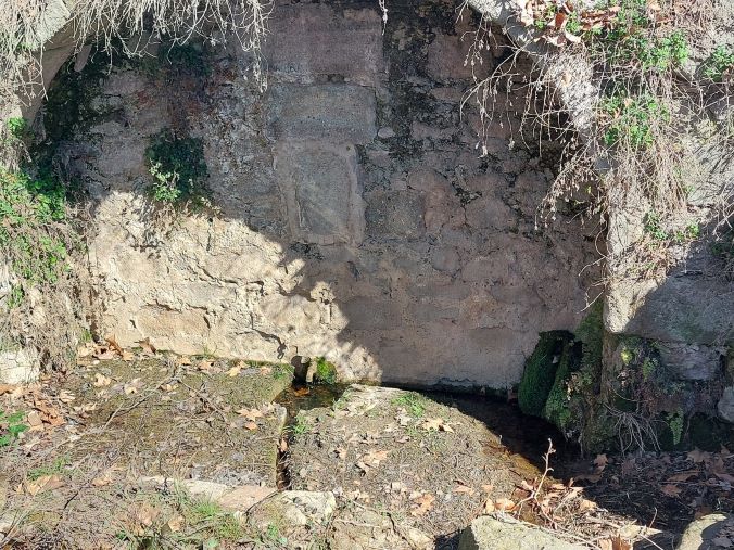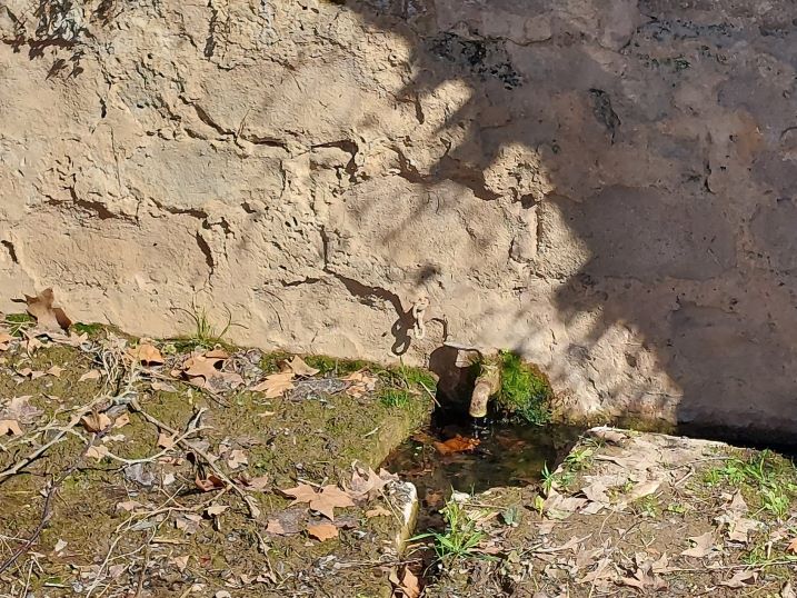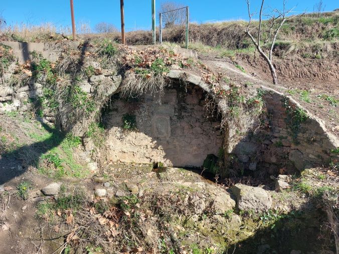 Esta dins d’una arcada de pedra, on una aixeta polsador dona aigua a una pica molt a nivell del terra.