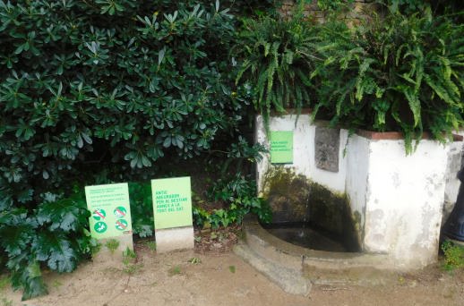 A prop del roserar hi ha una font de ceràmica coronada amb un brollador, obra de Llorenç Artigas.