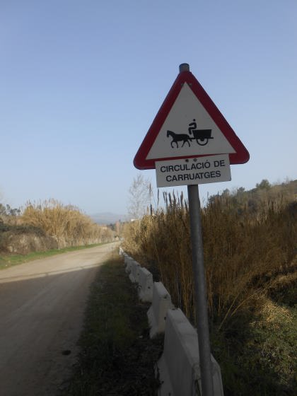 Una senyal poc usual, situada el camí que va de Sabadell a Castellar del Vallès per la vora del riu Ripoll. Que ens alerta del perill de trobar carruatges… ehi, que estem al 2016 !