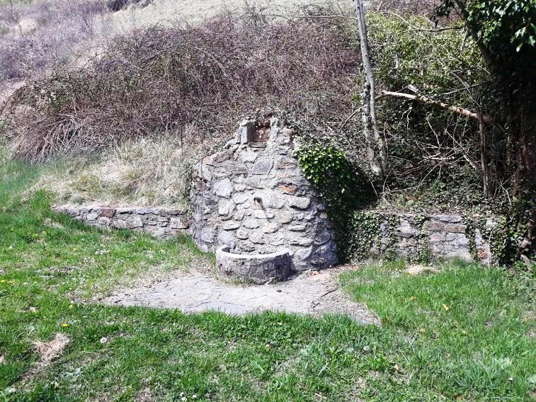 Font d’un sol broc protegida per una estructura de forma el·líptica formada per una paret de còdols units amb ciment pòrtland i protegida per tot el seu carener per una filera de maons.