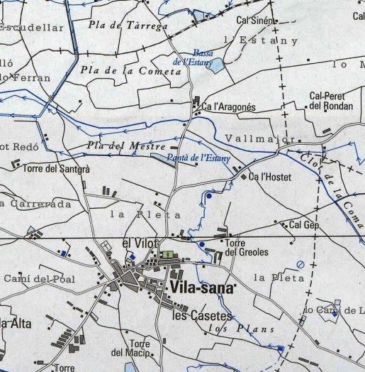 El Pantà de l’Estany, esta situat al Pla del Mestre, a mitat de la carretera L-334 i a l’esquerra, que porta des del nucli de Vila-sana a ca l’Aragonés, finca important de la zona.