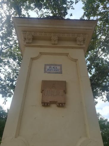 Quatre plàtans flanquegen els costats del rectangle que forma la base de paviment.
