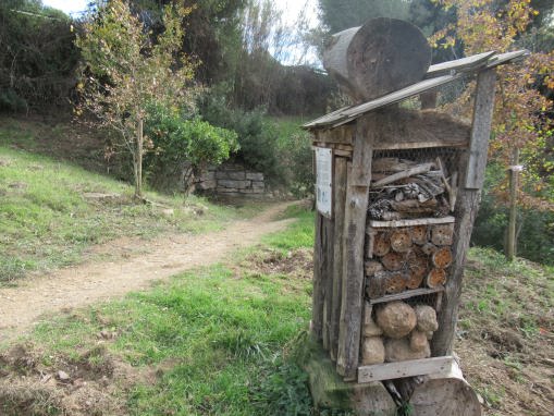 En la part de darrera, hi ha un cartell indicatiu que és un Hotel d’insectes per afavorir la nidificació de pol·linitzadors, i les entitats que han portat el projecta.