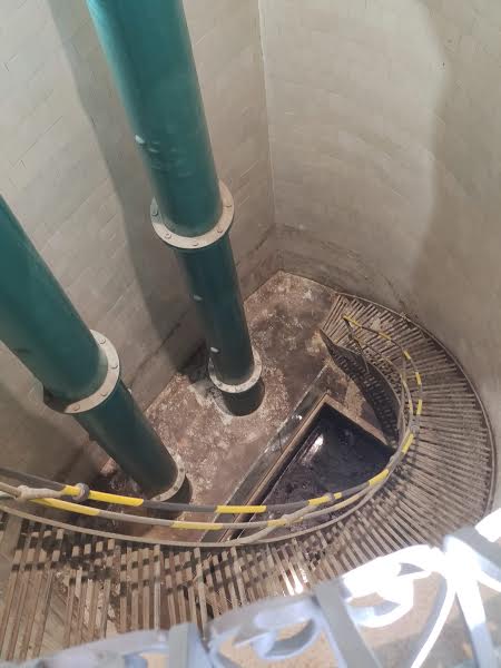 L’edifici principal, situat al mig del solar, conté els pous, les bombes, calderes i la màquina de vapor.