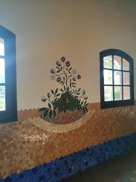 La part baixa del parament està formada per un sòcol de pedra a l’exterior i un arrambador de trencadís a l’interior. En l’eix de simetria s’intersecciona amb un cos perpendicular que s’expressa en la façana amb un frontó esglaonat.