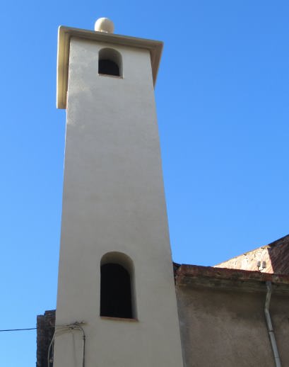 La teulada es a quatre aigües i presenta una esfera de munt, les obertures són en arc de mig punt, amb una d’elles a cada cara de la torre a la part superior, i una a mitja altura que dona al carrer Col·legi.