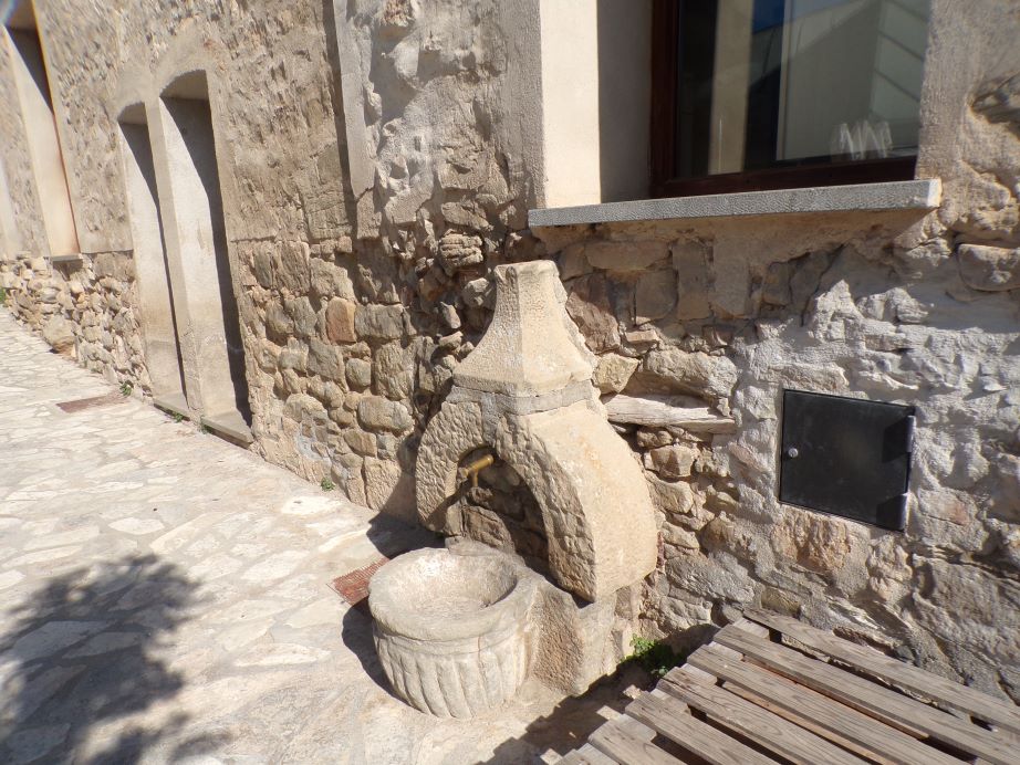 Al costat de les escales que pujant a la cuina del edifici del Casal, i a baix adossada a la paret, hi ha la Font.