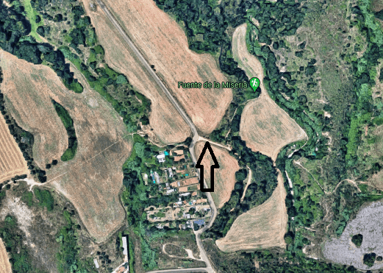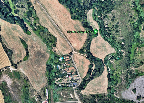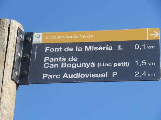 Un cartell ens indica seguir per l’esquerra per un corriol descendent que ens durà ràpidament a un camp. on a l’esquerra, sota una destacada figuera ens queda La font de la Misèria.