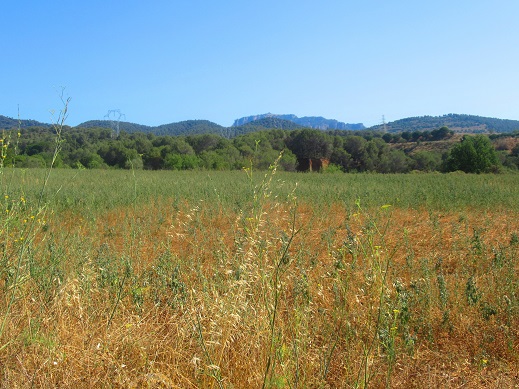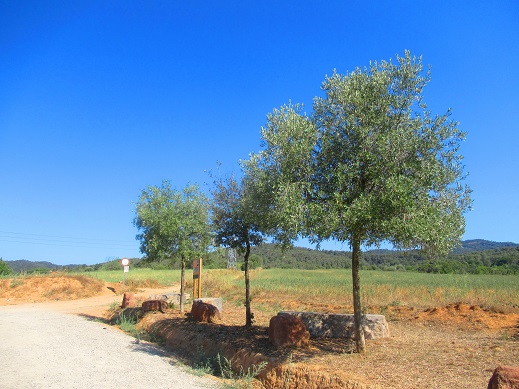 Cal seguir a peu pel camí barrat amb una cadena al pas dels vehicles. Un cartell ens indica seguir per l’esquerra per un corriol descendent que ens durà ràpidament a un camp,