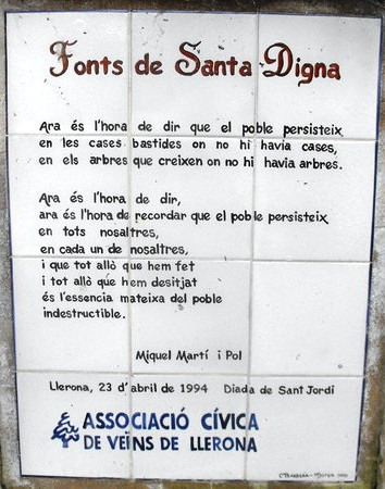 i avui visitem la segona, La Font de Santa Digna.DSCN2251_01esta ubicada en la riba esquerra del riu Congost, tant just el punt on es deixa el municipi de Granollers i passa al de les Franqueses,DSCN2250_01 i esta en un Espai Natural Protegit, forma part de Natura 2000, enregistrat per la Unió Europea.DSCN2240_01Es una font de molt poca aigua surant tot l’any i no es recomana beuran d’aquesta aigua.DSCN2252_01La seva característica principal, es el vers de Miquel Martí Pol, plasmat en unes rajoles de munt de la font.fghfg_01Fa uns anys estava molt plena de vegetació i casi oblidada per la gent, es quan es va decidir fer una actuació de neteja de la font i rodalies d’aquesta.8732-foto_neteja_font_santa_digna_1_01Mes informació :