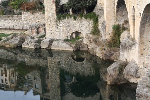 fins arribar al riu Fluvià, abans de creuar-ho teniu una explanada a la vostra esquerra on esta la sortida de l’aigua sota d’unes grans roques.