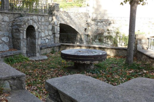 En la mateixa estructura de la Font i ha una roda de molí no massa gran.