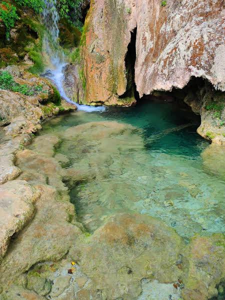 on les aigües de la riera de la Rotllada cauen fent un salt i formant un gorg amb les seves aigües.