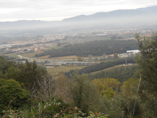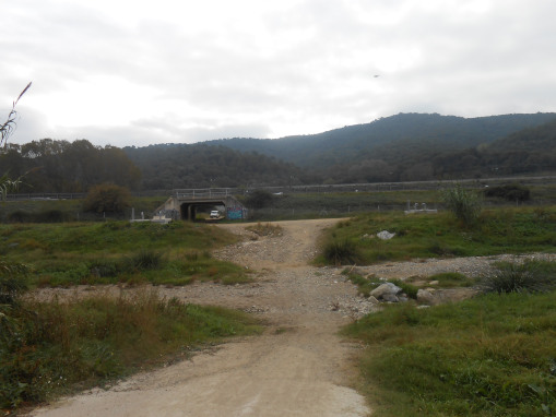 A l’arribar a un camí ample que baixa al riu , al creuem, seguirem tot recta per una ample pista que passa per sota de l’Autopista, la carretera de l’Eix i del tren de l’AVE.