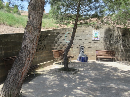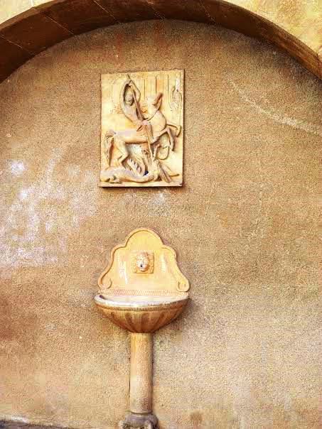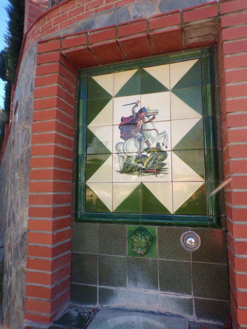 A sobre de la font hi ha unes rajoles a color amb la figura de Sant Jordi matant el drac.