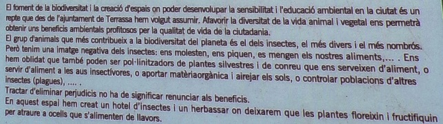 La ciutat de Terrassa des de fa pocs anys ha apostat en introduir els Hotels d’Insectes a pràcticament en tots els diferents barris, en jardins, parcs, illetes urbanes…
