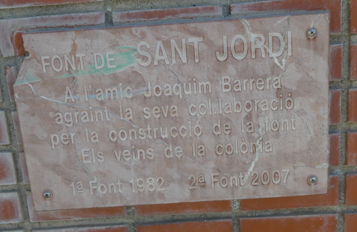 Un cartell a un nivell baix podem llegir : Font de Sant Jordi –A l’amic Joaquim Barrera, agraint la seva col-laboració per la construcció de la Font. Els veïns de La Colònia. 1ª Font 1982 / 2ª Font 2007.