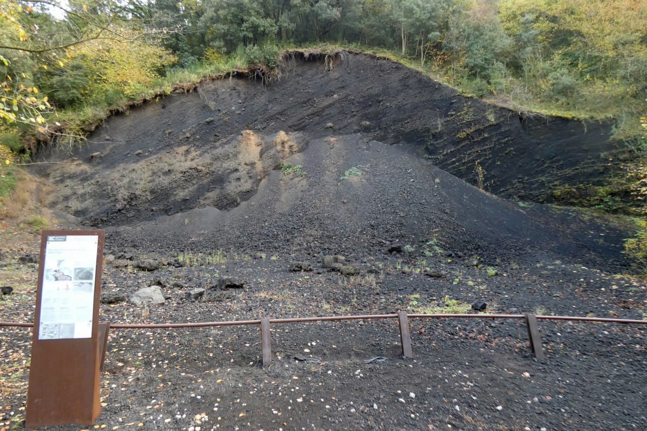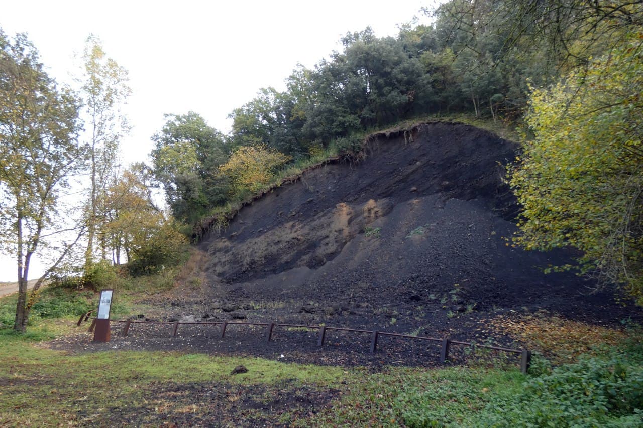 on es poden observar els piroclastos (lapil•lis i blocs) de color molt altament negre que van formar el seu con volcànic.