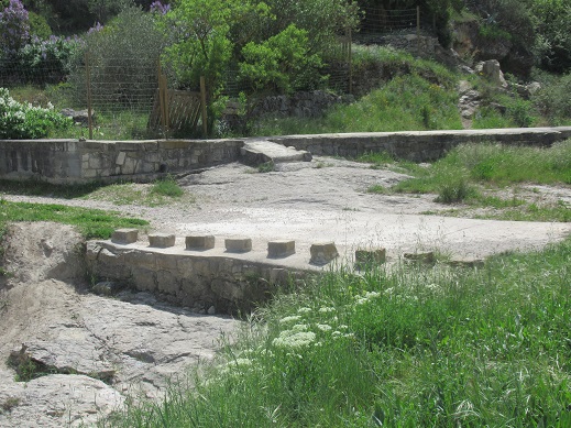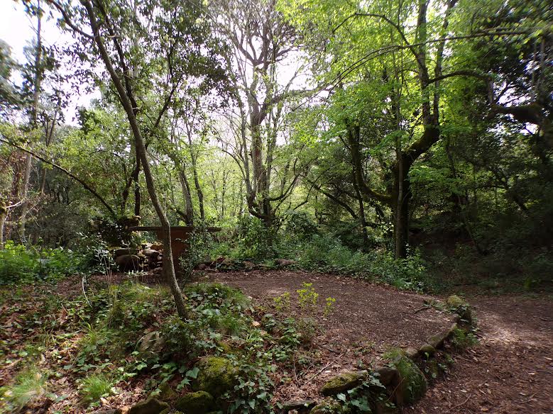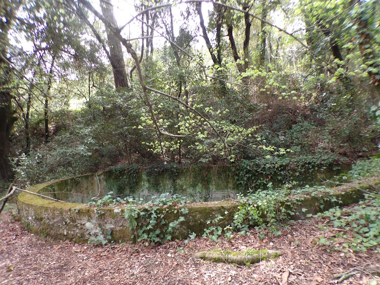 i un banc fet de pedra del qual en queden nombroses restes mig tapades per la molsa.