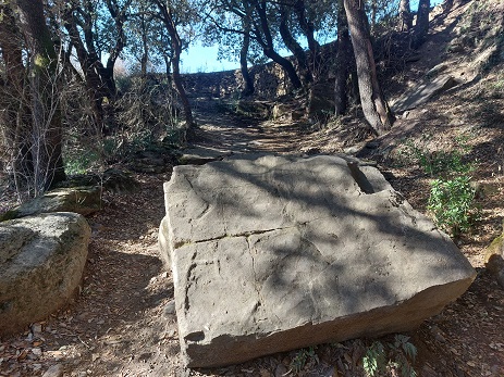 d’on raja l’aigua que es recull en un canal, fet amb pedra saulonenca, que la porta fins al safareig, una construcció rectangular de pedra on s’hi accedeix mitjançanat unes escales,