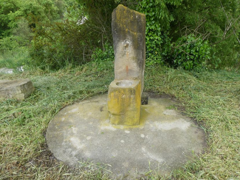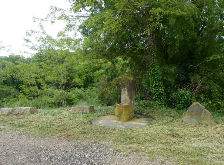 La pica de desguàs i l’aixeta, de polsador i cromada, estan posades en un podi de planta rectangular fet de pedra, damunt el qual s’aixeca una creu de pedra, flanquejada per dues esferes granítiques.
