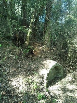 Un cop al replà inferior, hi ha una obertura (tancada amb una porta de ferro) que s’endinsa al talús de contenció fet amb pedra.